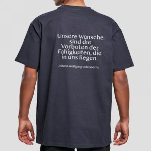 Rückenprint mit Goethe-Zitat: „Unsere Wünsche sind die Vorboten der Fähigkeiten, die in uns liegen.“